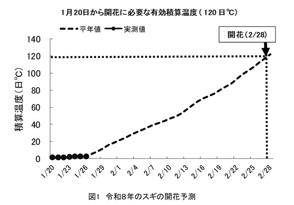 平野部の観測定点のスギ林から雄花の着いた枝を採取してきて、15℃に設定した人工気象器を用いて実験した結果、1月20日からの積算温度が120日℃で開花しました。よって、今後の気温が例年並み(平成3~令和7年の平均値)に推移した場合、2月28日頃に開花し、花粉の本格的な飛散が始まると予想されます(図1)。これは、昨年(3月1日)より1日早く、例年(2月25日)より3日遅い開花予想となります。