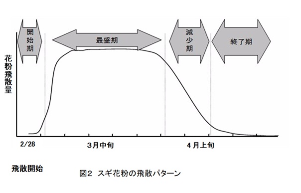 今シーズンの花粉飛散量は、例年より「やや多くなる」と予想されており、平野部では4,900個/cm2程度の飛散量が見込まれます。詳細は県森林研究所のホームページをご覧ください。また、予想されるスギ花粉の飛散パターンは、図2のとおりです。
