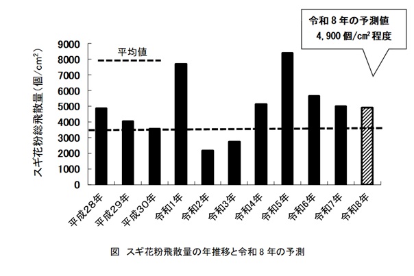 令和8年のスギ花粉飛散量は、2月~4月のシーズン中に平野部で1cm2当たり4,900個程度と例年よりやや多くなる見込みです。これは、花粉飛散の調査を開始した平成3年から令和7年までの平均値(3,448個/cm2)の1.4倍程度です。(令和7年 5,002個/cm2 と同程度)